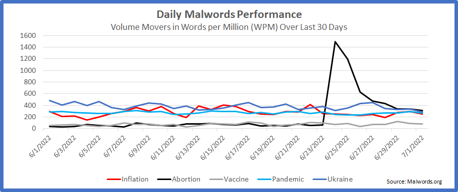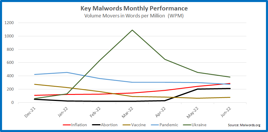 Volume players (terms with over 50K instances YTD in the news corpora) , continue to be led by by UKRAINE (-15% 30D) but in a rapidly tightening field. INFLATION (+18% 30D) has eclipsed PANDEMIC on a monthly basis, while ABORTION’s second spike of the year has elevated its June volumes, pulling eyeballs from INFLATION in the dailies.