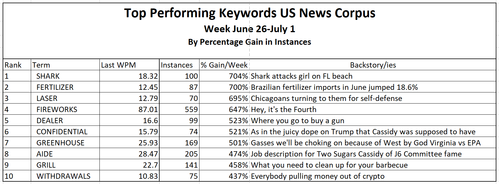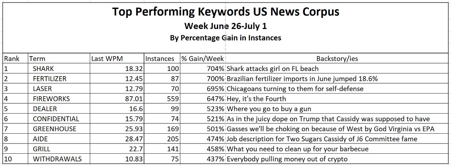 ABORTION finishes out this week at #1 in the dailies, but overall trajectory has it falling back to the critical 50WPM level later this summer. For further discussion check out the discussion in our previous post “The Left Has Lost Control of Language.” The only macro effect of ABORTION’s Second Coming has been to narrow the field and force out the underperforming terms.